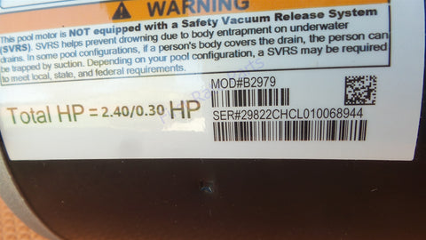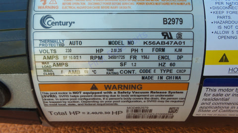 Century Pool Pump Motor, 2.0/.25 HP, 1 Ph, 60 Hz, 230 V, 3600 RPM, Y56J Frame, DP - B2979